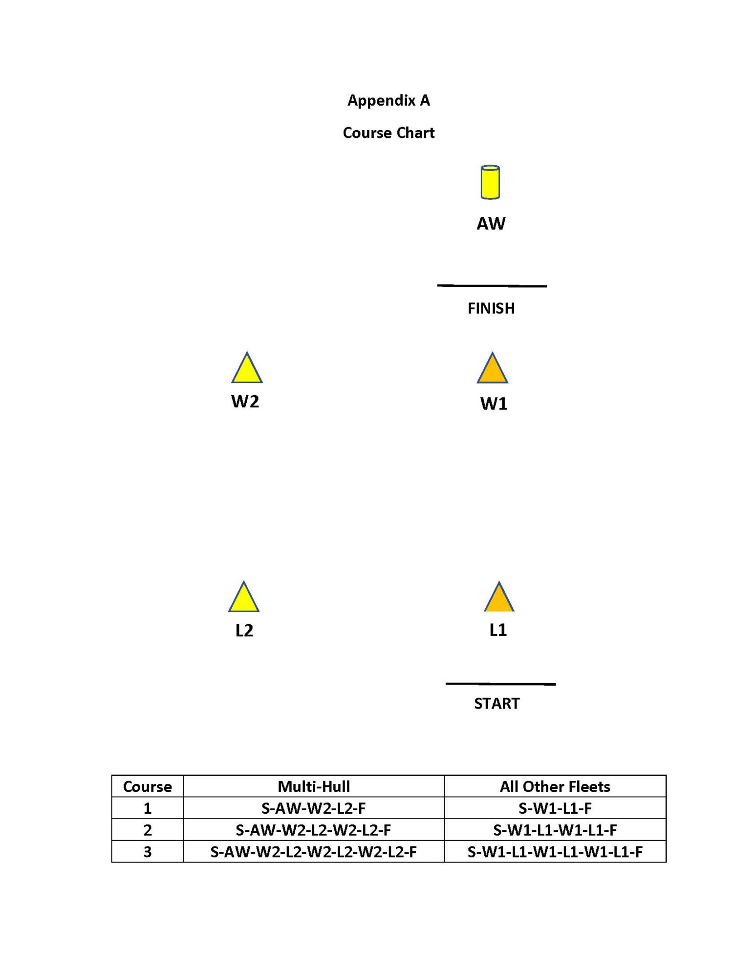 - For all boats in the multi hull class their windward leeward legs are separate from those of the monohull classes. The windward and leeward marks of the offset course legs will be yellow tetrahedrons. The Windward mark shall be a Yellow cylinder set some distance to windward of the standard Orange Tetrahedron windward mark. The Multi Hull Fleet will round the Yellow cylinder proceed to round the